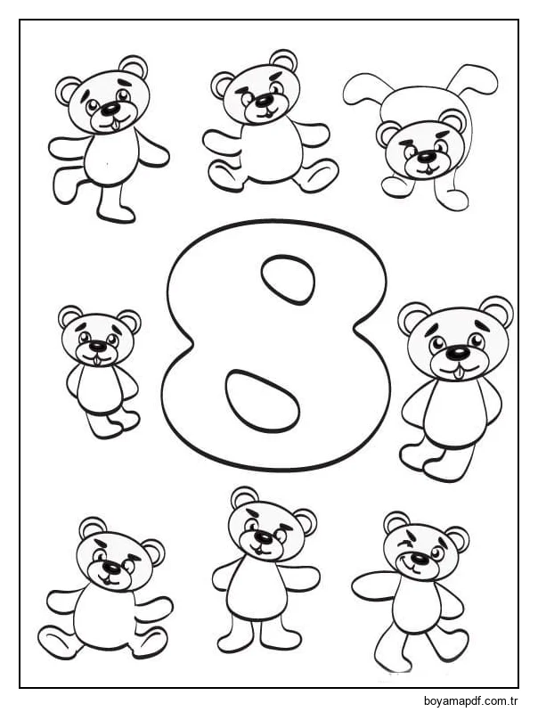 8 oyuncak ayı ile 8 numara Boyama Sayfası