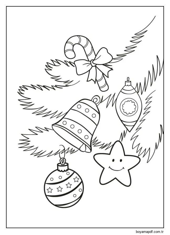 Ağaç ana Noel sembolleri ile süslenmiştir. Boyama Sayfası