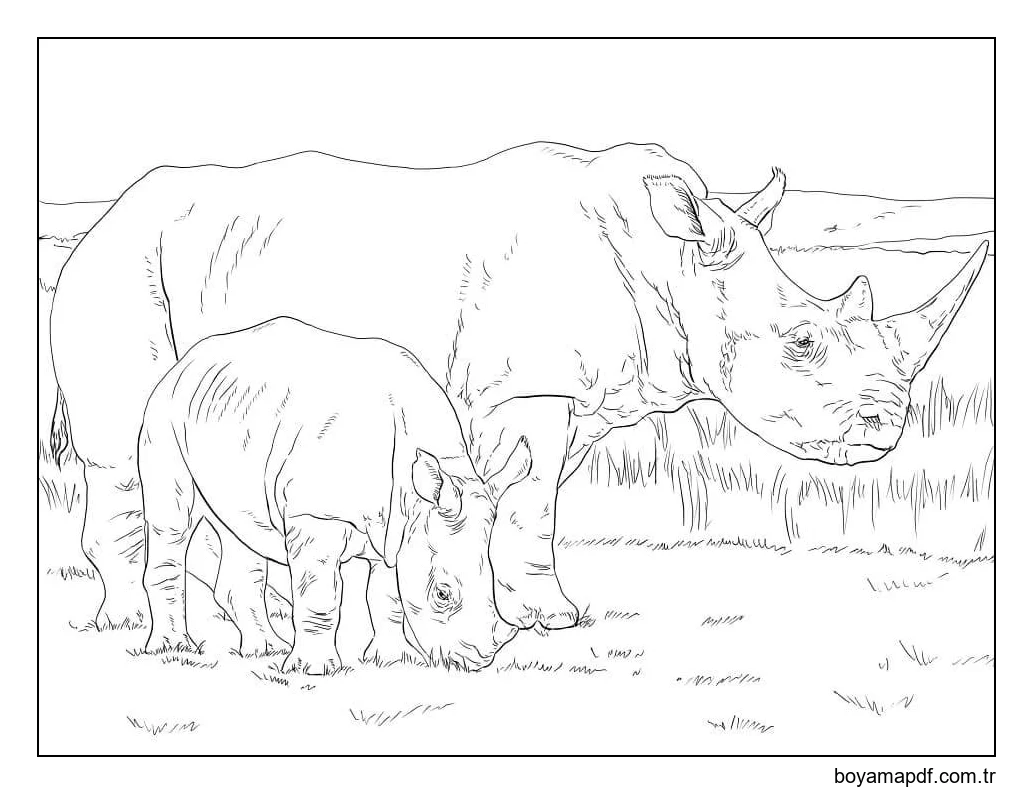 Beyaz Gergedan Anne ve Bebek Boyama Sayfası