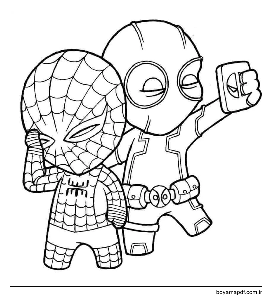Chibi örümcek adam ve Deadpool'u çiz Boyama Sayfası