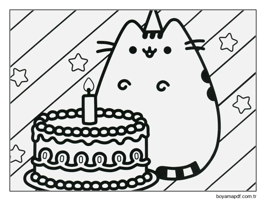 Doğum Günü Pastası ile Pusheen Boyama Sayfası