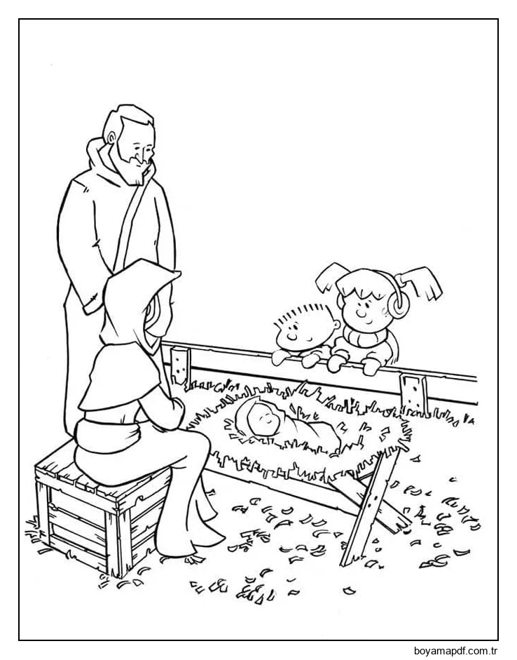 Doğum Sahnesi ana hatları yazdırılabilir Boyama Sayfası