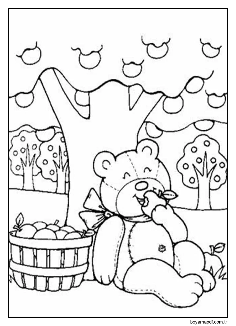 Elma Ağacıyla Elma Yiyen Oyuncak Ayı Boyama Sayfası