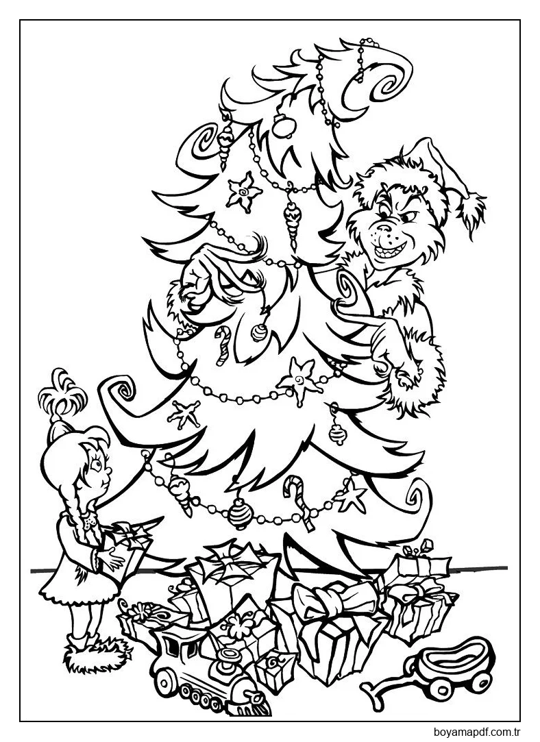 Grinch Noel Ağacı Süsliyor Boyama Sayfası