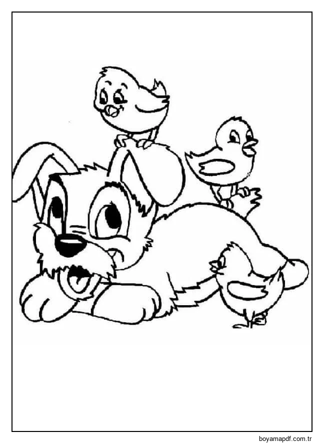 Kuşlarla Oynayan Köpek Yavrusu Boyama Sayfası