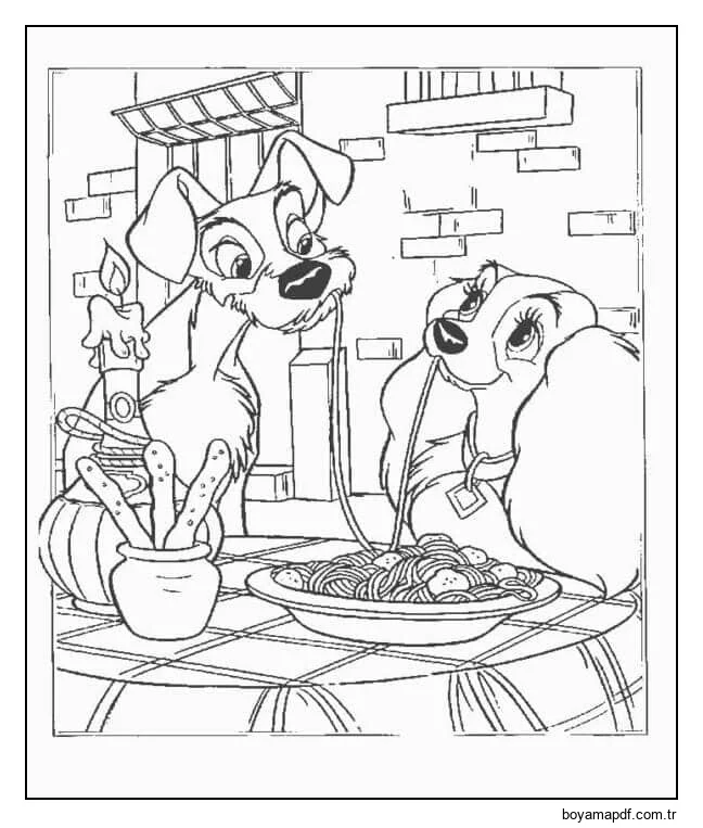 Lady ve The Tramp akşam yemeğiyle Boyama Sayfası