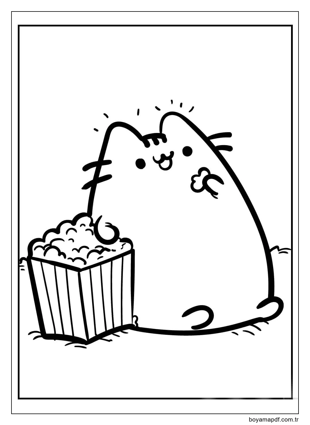 Pusheen Patlamış Mısır Yiyor Boyama Sayfası
