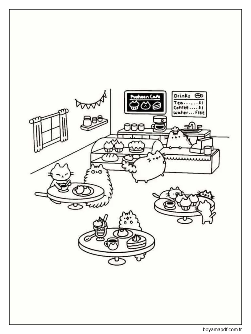 Pusheen ve Arkadaşları Evde Boyama Sayfası