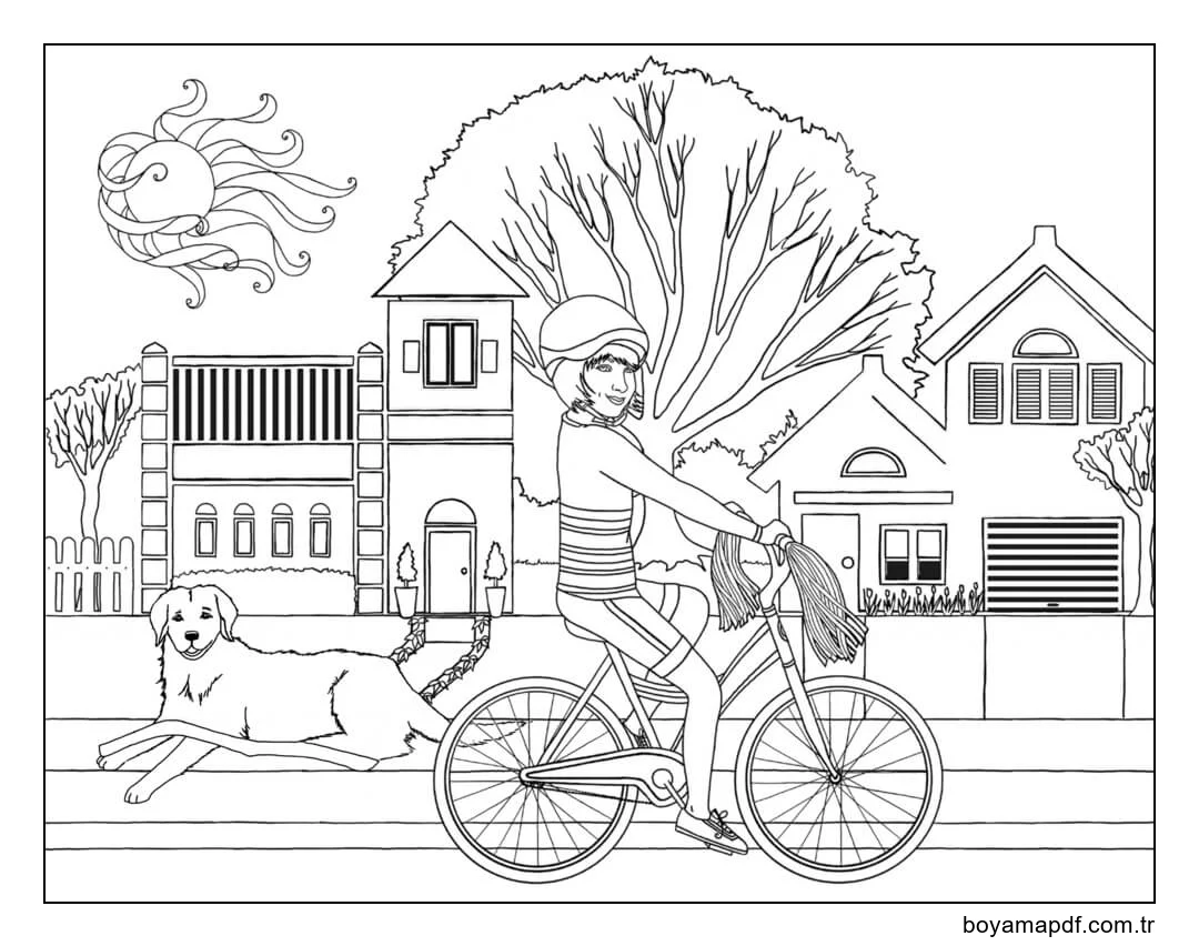 Şehirde Bisiklete Binen Kız Boyama Sayfası