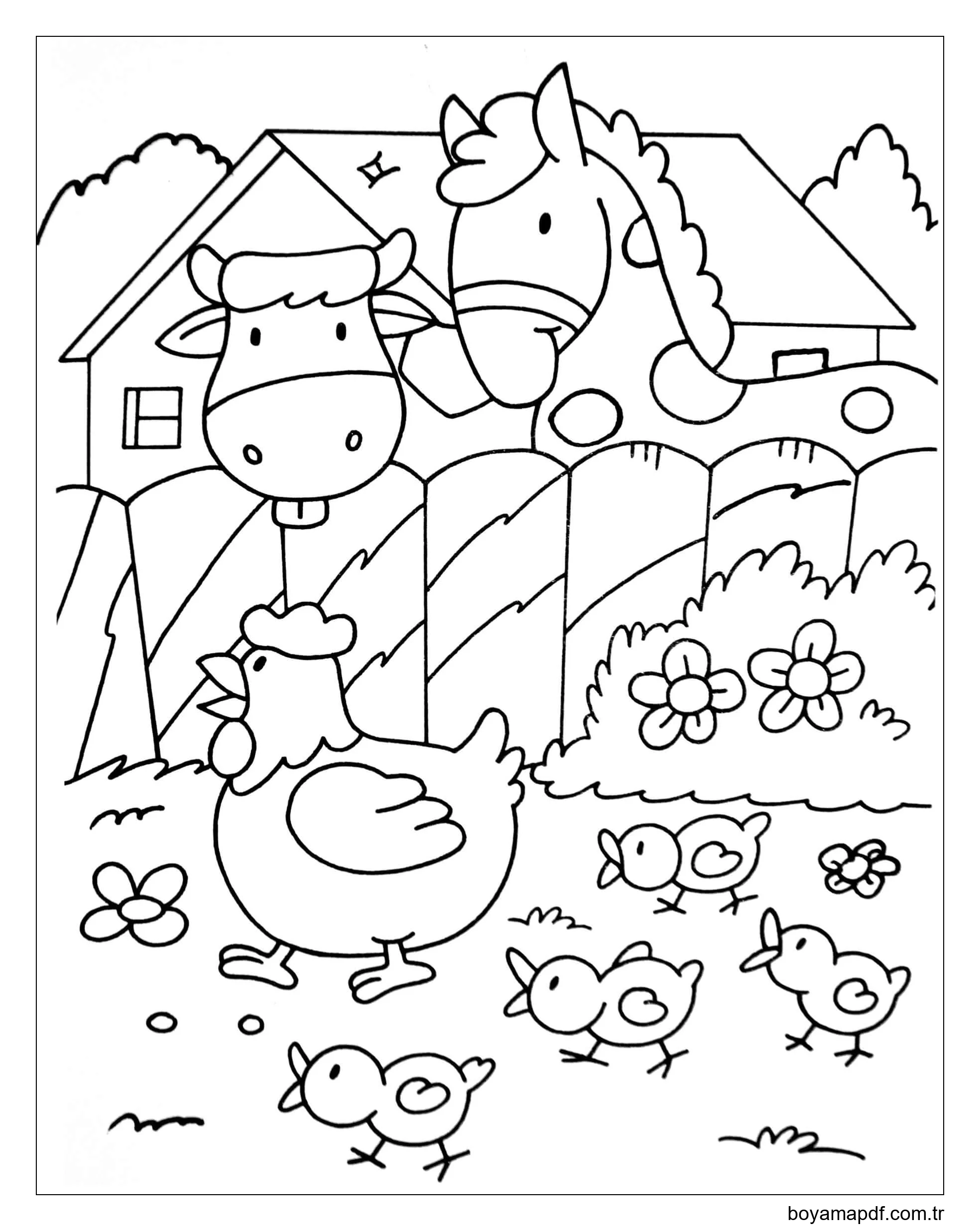 Tavuklar ile Inekler ve Atlar Boyama Sayfası