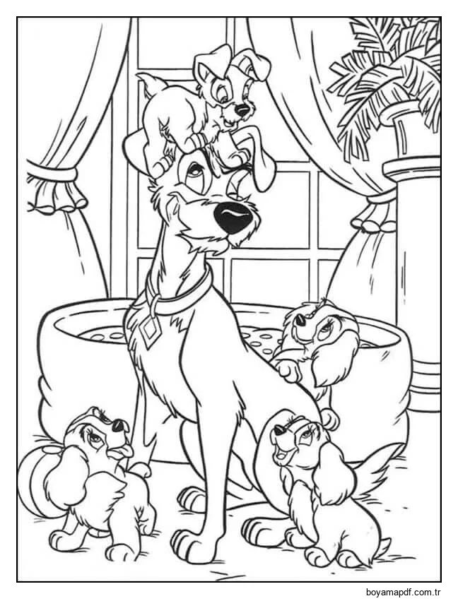 Yavru köpekler Tramp ile oynuyor Boyama Sayfası